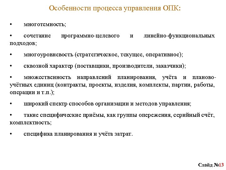 Особенности процесса управления ОПК: многотемность; сочетание подходов; программно-целевого и линейно-функциональных многоуровневость (стратегическое, текущее, оперативное); сквозной характер (поставщики, производители, заказчики); множественность направлений планирования, учёта и плановоучётных единиц (контракты, проекты, изделия, комплекты, партии, работы, операции и т. п.); широкий спектр способов организации и методов управления; такие специфические приёмы, как группы опережения, серийный счёт, комплектность; специфика планирования и учёта затрат. Слайд № 13