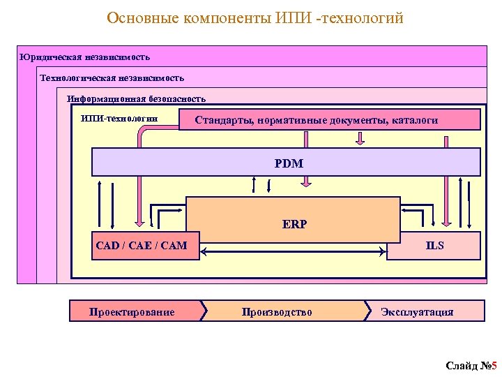 Основные компоненты ИПИ -технологий Юридическая независимость Технологическая независимость Информационная безопасность ИПИ-технологии Стандарты, нормативные документы, каталоги PDM ERP CAD / CAE / CAM Проектирование ILS Производство Эксплуатация Слайд № 5