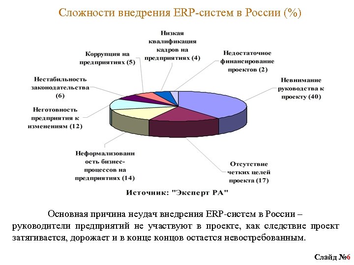 Сложности внедрения ERP-систем в России (%) Основная причина неудач внедрения ERP-систем в России – руководители предприятий не участвуют в проекте, как следствие проект затягивается, дорожает и в конце концов остается невостребованным. Слайд № 6