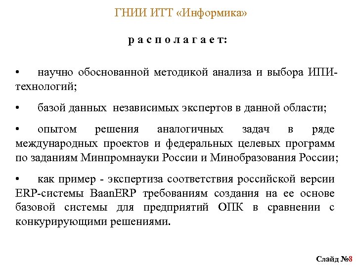 ГНИИ ИТТ «Информика» р а с п о л а г а е т: научно обоснованной методикой анализа и выбора ИПИтехнологий; базой данных независимых экспертов в данной области; опытом решения аналогичных задач в ряде международных проектов и федеральных целевых программ по заданиям Минпромнауки России и Минобразования России; как пример - экспертиза соответствия российской версии ERP-системы Baan. ERP требованиям создания на ее основе базовой системы для предприятий ОПК в сравнении с конкурирующими решениями. Слайд № 8