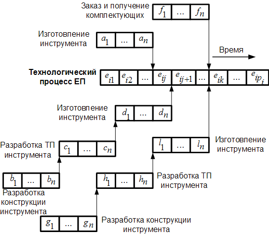 Допустим, что у нас есть некая ЕП e i (рис.2), представленная технологическим процессом в виде множества операций { e ij , j=1,...,p i } . Для каждой операции известны необходимые для выполнения: ресурсы, оборудование, инструмент, оснастка, комплектующие, документация и пр. В процессе комплектации при проверке какой-либо j-й операции может оказаться, что для нее требуется специальный инструмент, который не может быть приобретен в силу уникальности, а следовательно, должен быть изготовлен раньше, чем начнется по плану j-я операция. На j+1-й операции может оказаться, что для нее требуется специальное приспособление и этого приспособления не только не в наличии, но оно даже не спроектировано. И, наконец, на какой-либо k-й операции анализ покажет, что, во-первых, необходимо приобретение стандартных комплектующих, которых нет на складе предприятия, и нет специального мерительного инструмента, который еще предстоит разработать и изготовить. Все то, что мы указали в качестве недостающих ресурсов для выполнения технологических операций, - наших ЕП, необходимо обеспечить к моменту их начала.