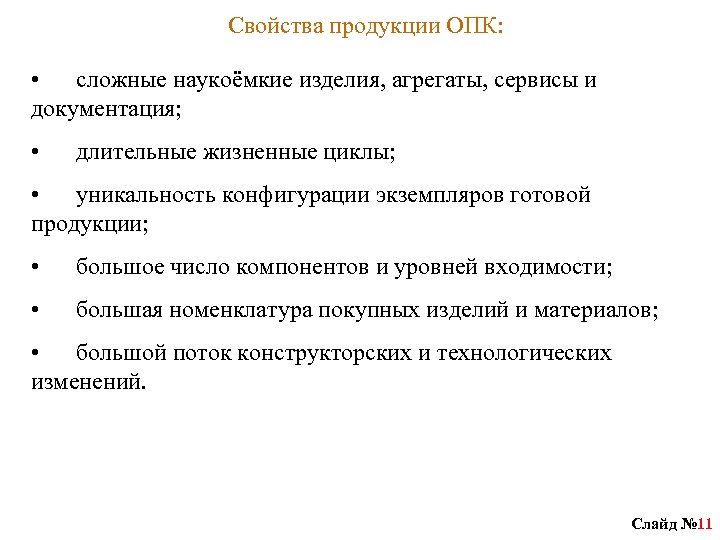Свойства продукции ОПК: сложные наукоёмкие изделия, агрегаты, сервисы и документация; длительные жизненные циклы; уникальность конфигурации экземпляров готовой продукции; большое число компонентов и уровней входимости; большая номенклатура покупных изделий и материалов; большой поток конструкторских и технологических изменений. Слайд № 11
