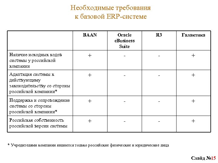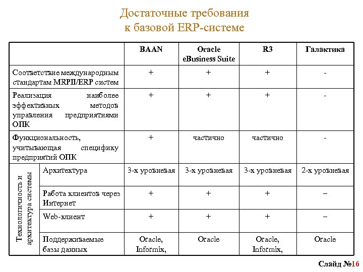 Необходимые требования к базовой ERP-системе BAAN Oracle e. Business Suite R 3 Галактика Наличие исходных кодов системы у российской компании + - - + Адаптация системы к действующему законодательству со стороны российской компании* + - - + Поддержка и сопровождение системы со стороны российской компании* + - - + Российская собственность российской версии системы + - - + * Учредителями компании являются только российские физические и юридические лица Слайд № 15