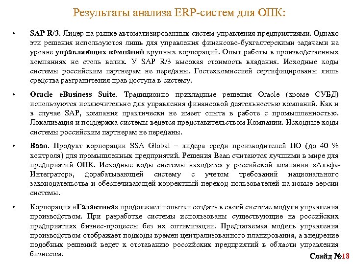 Результаты анализа ERP-систем для ОПК: SAP R/3. Лидер на рынке автоматизированных систем управления предприятиями. Однако эти решения используются лишь для управления финансово-бухгалтерскими задачами на уровне управляющих компаний крупных корпораций. Опыт работы в производственных компаниях не столь велик. У SAP R/3 высокая стоимость владения. Исходные коды системы российским партнерам не переданы. Гостехкомиссией сертифицированы лишь средства разграничения прав доступа в систему. Oracle e. Business Suite. Традиционно прикладные решения Oracle (кроме СУБД) используются исключительно для управления финансовой деятельностью компаний. Как и в случае SAP, компания практически не имеет опыта в работе с промышленностью. Локализация и поддержка системы ведется представительством Компании. Исходные коды системы российским партнерам не переданы. Baan. Продукт корпорации SSA Global – лидера среди производителей ПО (до 40 % контроля) для промышленных предприятий. Решения Baan считаются лучшими в мире для предприятий ОПК. Исходные коды системы находятся у российской компании «Альфа. Интегратор» , дорабатывающей систему с учетом требований национального законодательства и обеспечивающей корректный переход пользователей на новые версии системы. Корпорация «Галактика» продолжает попытки создать в своей системе модули управления производством. При разработке системы использованы существующие на российских предприятиях бизнес-процессы без их оптимизации. Предлагаемая модель управления производством отображает подходы времен централизованного планирования, а внедрение подобных решений ведет к отставанию российских предприятий в области управления бизнесом. Слайд № 18