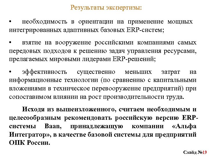 Результаты экспертизы: необходимость в ориентации на применение мощных интегрированных адаптивных базовых ERP-систем; взятие на вооружение российскими компаниями самых передовых подходов к решению задач управления ресурсами, прелагаемых мировыми лидерами ERP-решений; эффективность существенно меньших затрат на информационные технологии (по сравнению с капитальными вложениями в техническое перевооружение предприятий) при сопоставимом влиянии на рост производительности труда. Исходя из вышеизложенного, считаем необходимым и целесообразным рекомендовать российскую версию ERPсистемы Baan, принадлежащую компании «Альфа Интегратор» , в качестве базовой системы для предприятий ОПК России. Слайд № 19