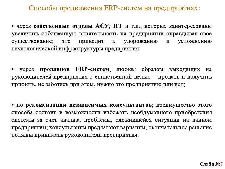 Способы продвижения ERP-систем на предприятиях: через собственные отделы АСУ, ИТ и т. п. , которые заинтересованы увеличить собственную влиятельность на предприятии оправдывая свое существование; это приводит к удорожанию и усложнению технологической инфраструктуры предприятия; через продавцов ERP-систем, любым образом выходящих на руководителей предприятия с единственной целью – продать и получить прибыль, не заботясь при этом, нужно это предприятию или нет; по рекомендации независимых консультантов; преимущество этого способа состоит в возможности избежать необдуманного приобретения системы за счет анализа проблемы, сложившейся ситуации на данном предприятии; консультанты предлагают варианты, окончательное решение должны принимать руководители предприятия. Слайд № 7