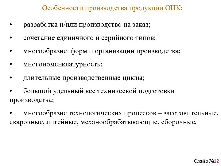 Особенности производства продукции ОПК: разработка и/или производство на заказ; сочетание единичного и серийного типов; многообразие форм и организации производства; многономенклатурность; длительные производственные циклы; большой удельный вес технической подготовки производства; многообразие технологических процессов – заготовительные, сварочные, литейные, механообрабатывающие, сборочные. Слайд № 12