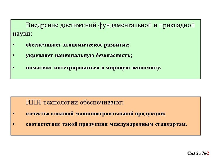 Внедрение достижений фундаментальной и прикладной науки: обеспечивает экономическое развитие; укрепляет национальную безопасность; позволяет интегрироваться в мировую экономику. ИПИ-технологии обеспечивают: качество сложной машиностроительной продукции; соответствие такой продукции международным стандартам. Слайд № 2