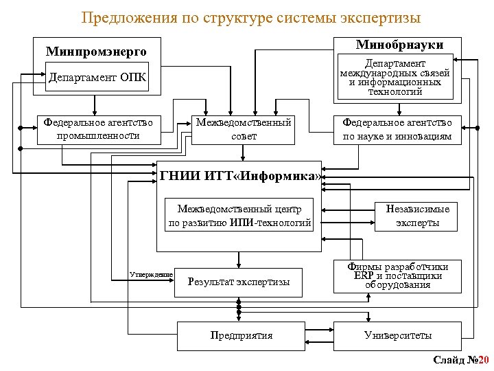 Предложения по структуре системы экспертизы Минобрнауки Минпромэнерго Департамент международных связей и информационных технологий Департамент ОПК Федеральное агентство промышленности Межведомственный совет Федеральное агентство по науке и инновациям ГНИИ ИТТ «Информика» Межведомственный центр по развитию ИПИ-технологий Утверждение Независимые эксперты Результат экспертизы Фирмы разработчики ERP и поставщики оборудования Предприятия Университеты Слайд № 20