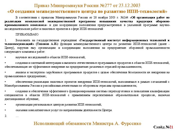 Приказ Минпромнауки России № 277 от 23. 12. 2003 «О создании межведомственного центра по развитию ИПИ-технологий» В соответствии с приказом Минпромнауки России от 28 ноября 2003 г. № 264 «Об организации работ по реализации комплексной межведомственной программы повышения качества продукции обороннопромышленного комплекса» и для координации выполнения предусмотренных в указанной программе научноисследовательских работ и пилотных проектов в сфере ИПИ-технологий ПРИКАЗЫВАЮ: 1. Возложить на государственное учреждение «Государственный институт информационных технологий и телекоммуникаций» (Тихонов А. Н.) функции межведомственного центра по развитию ИПИ-технологий (далее Центр), поручив ему организацию и координацию выполнения на предприятиях оборонной промышленности следующего комплекса работ: научных исследований в области ИПИ-технологий; создания и системной интеграции комплекта отечественных программных продуктов в области ИПИ-технологий, обеспечивающих их эффективное внедрение на предприятиях различных отраслей промышленности; анализа и экспертизы зарубежных программных продуктов с целью обеспечения безопасности их внедрения на промышленных предприятиях; обеспечения реализации пилотных проектов внедрения ИПИ-технологий, выполняемых в рамках соглашений с Минобразованием России и российскими агентствами по оборонным отраслям промышленности; создания и обеспечения эффективного функционирования системы переподготовки и повышения квалификации специалистов в области ИПИ-технологий с применением перспективных образовательных процессов, включая дистанционное обучение; организации региональных центров развития ИПИ-технологий; оказания консалтинговых услуг по направлениям деятельности Центра. 2. … Исполняющий обязанности Министра А. Фурсенко Слайд № 21