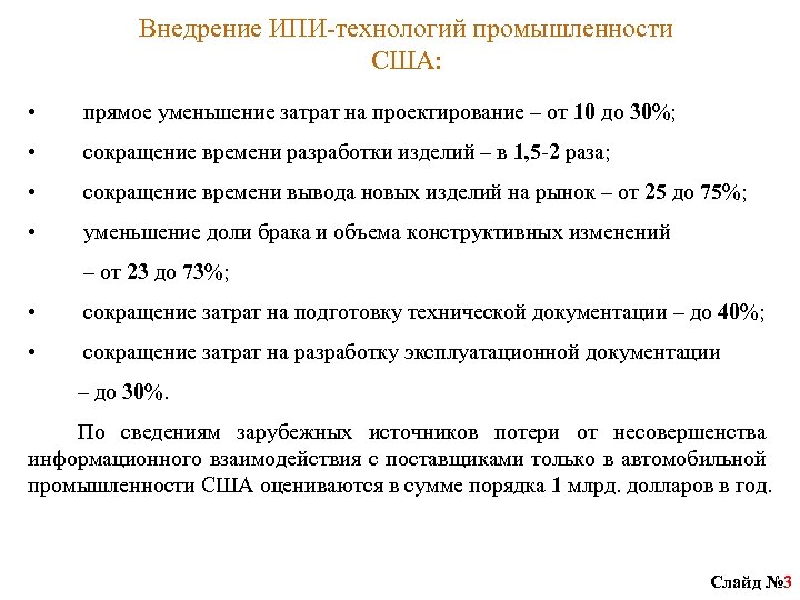Внедрение ИПИ-технологий промышленности США: прямое уменьшение затрат на проектирование – от 10 до 30%; сокращение времени разработки изделий – в 1, 5 -2 раза; сокращение времени вывода новых изделий на рынок – от 25 до 75%; уменьшение доли брака и объема конструктивных изменений – от 23 до 73%; сокращение затрат на подготовку технической документации – до 40%; сокращение затрат на разработку эксплуатационной документации – до 30%. По сведениям зарубежных источников потери от несовершенства информационного взаимодействия с поставщиками только в автомобильной промышленности США оцениваются в сумме порядка 1 млрд. долларов в год. Слайд № 3